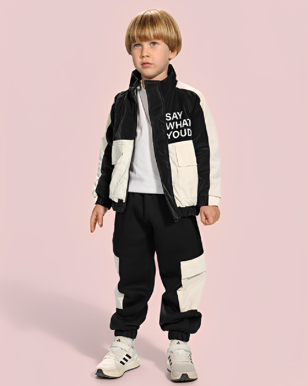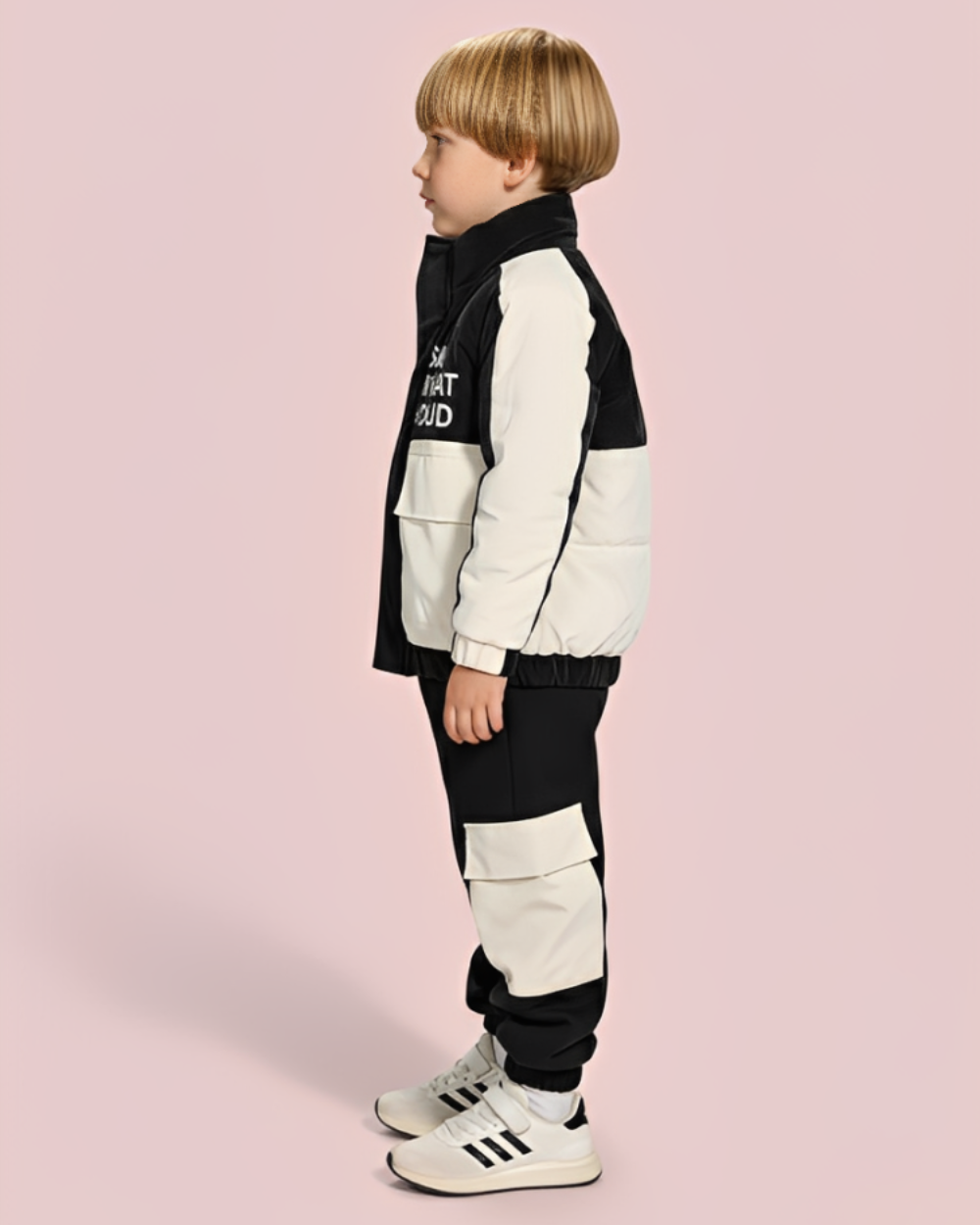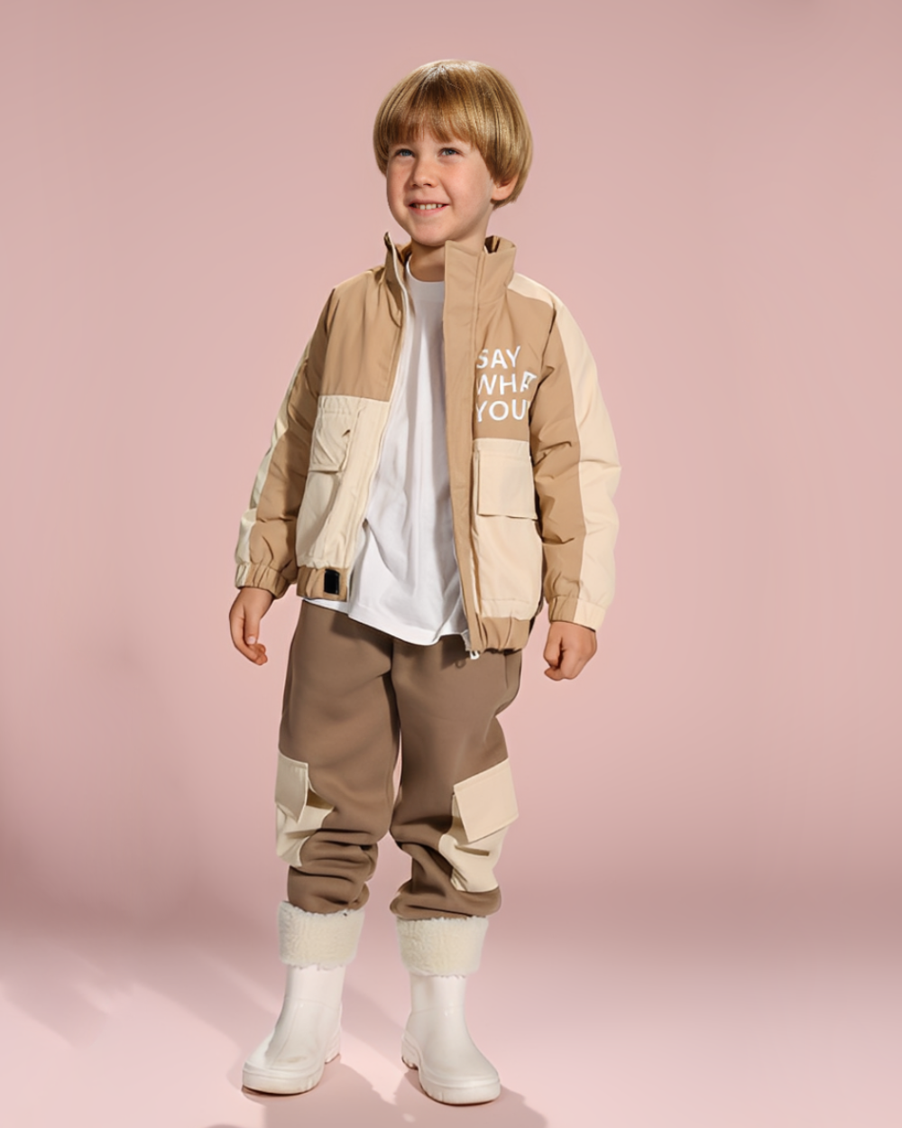 همسة تنسيق من زيلينا: “هذا الطقم يغنيكِ عن طبقات الملابس الكثيرة التي تعيق حركة طفلك. يكفي تيشيرت قطني خفيف تحته، مع حذاء رياضي قوي (أو بوت مطر)، وسيكون بطلنا الصغير جاهزاً لأي مغامرة!”