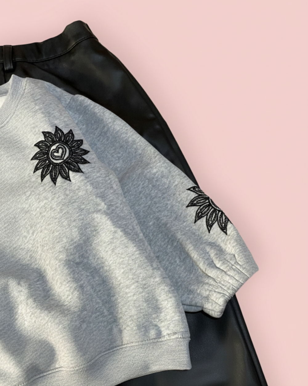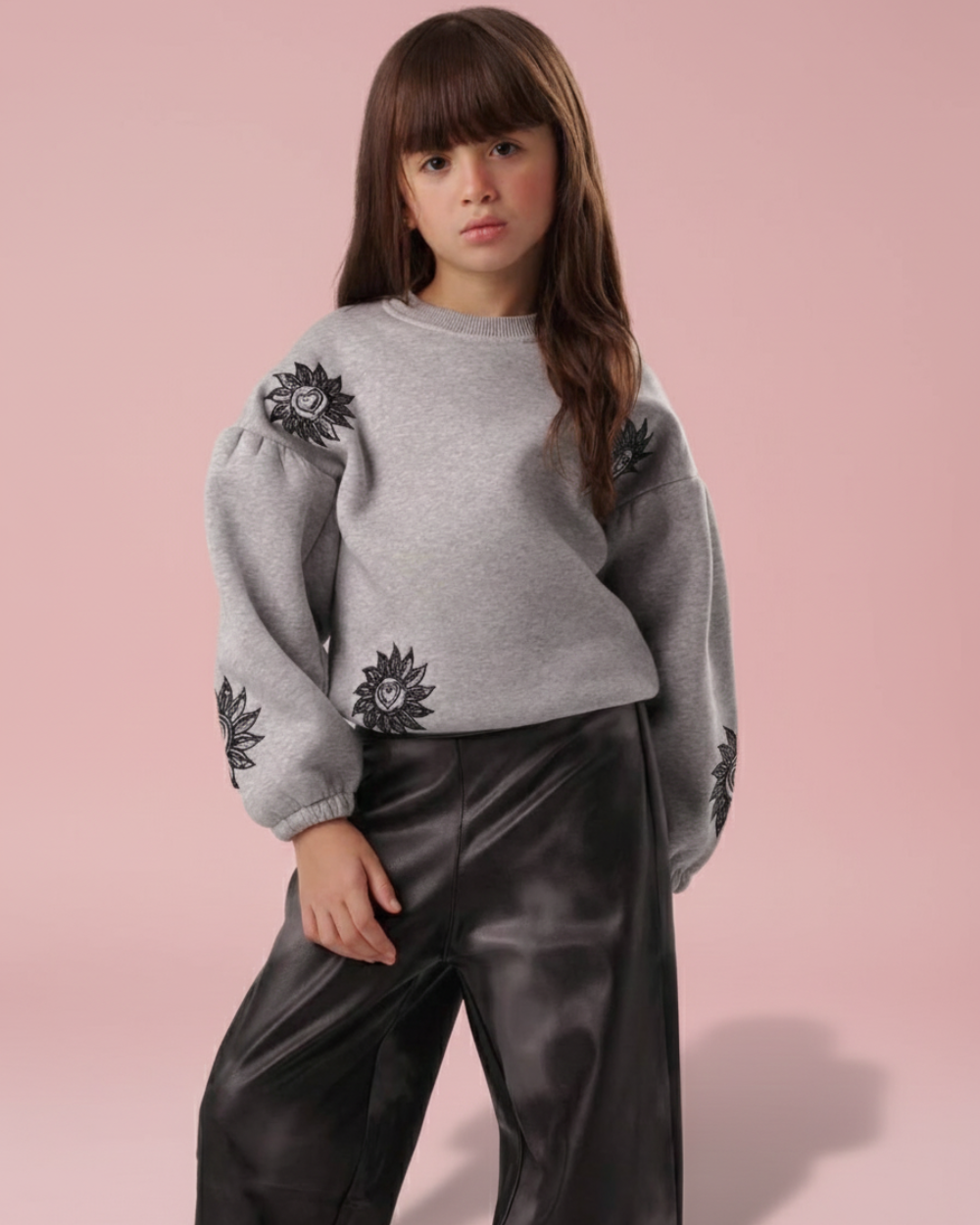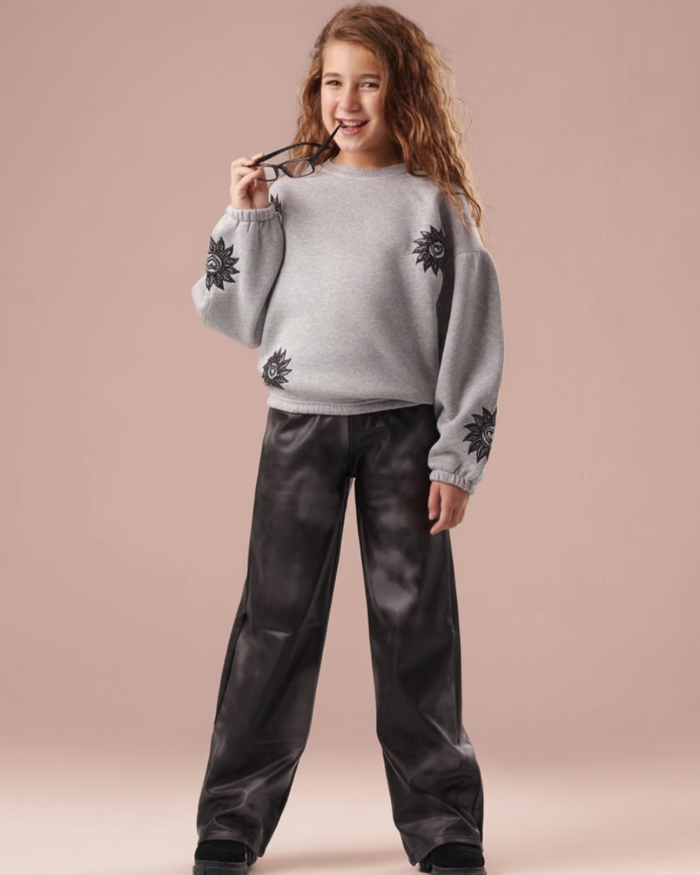 طقم خروج بناتي سويت شيرت ميلتون وتطريز فاخر مع بنطلون جلد