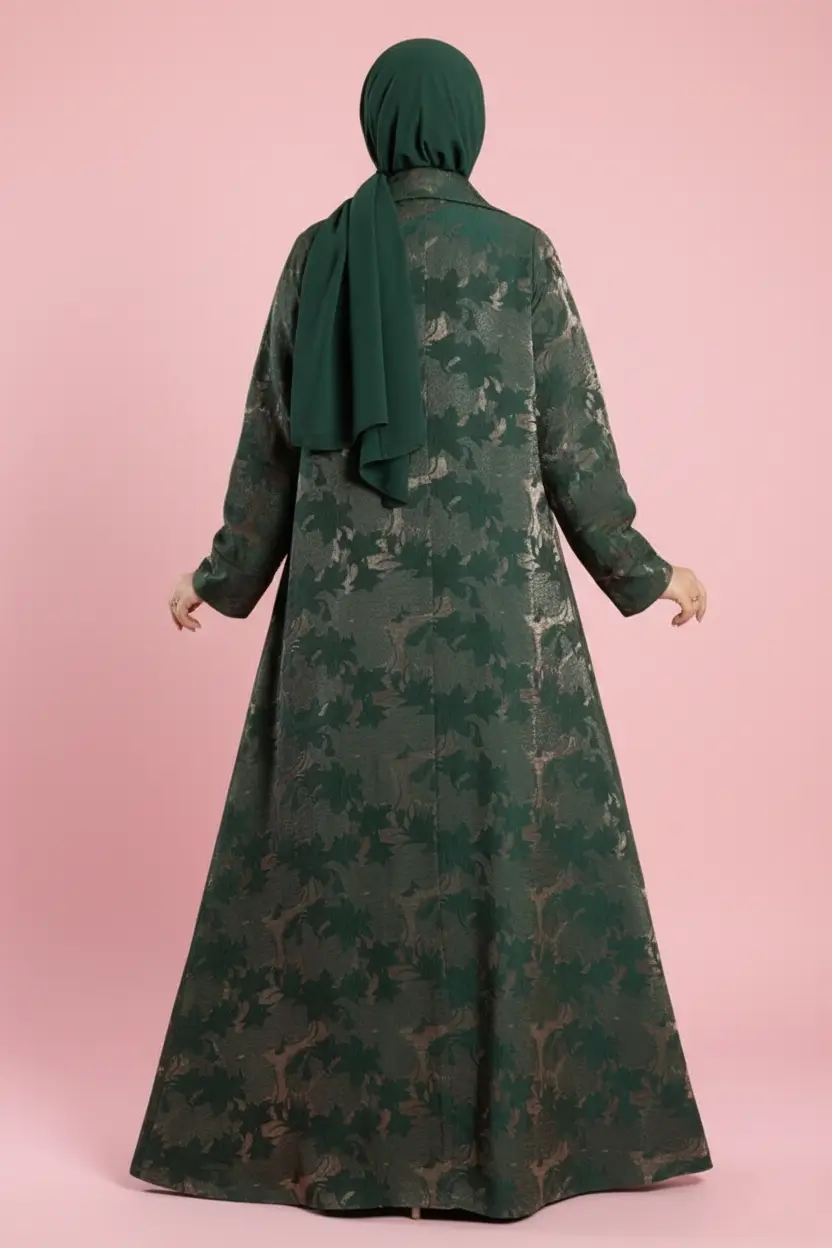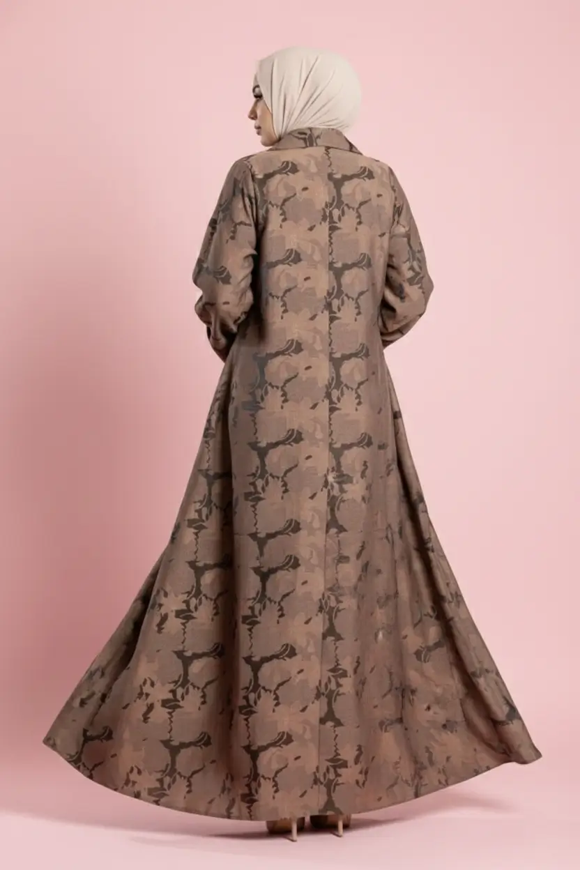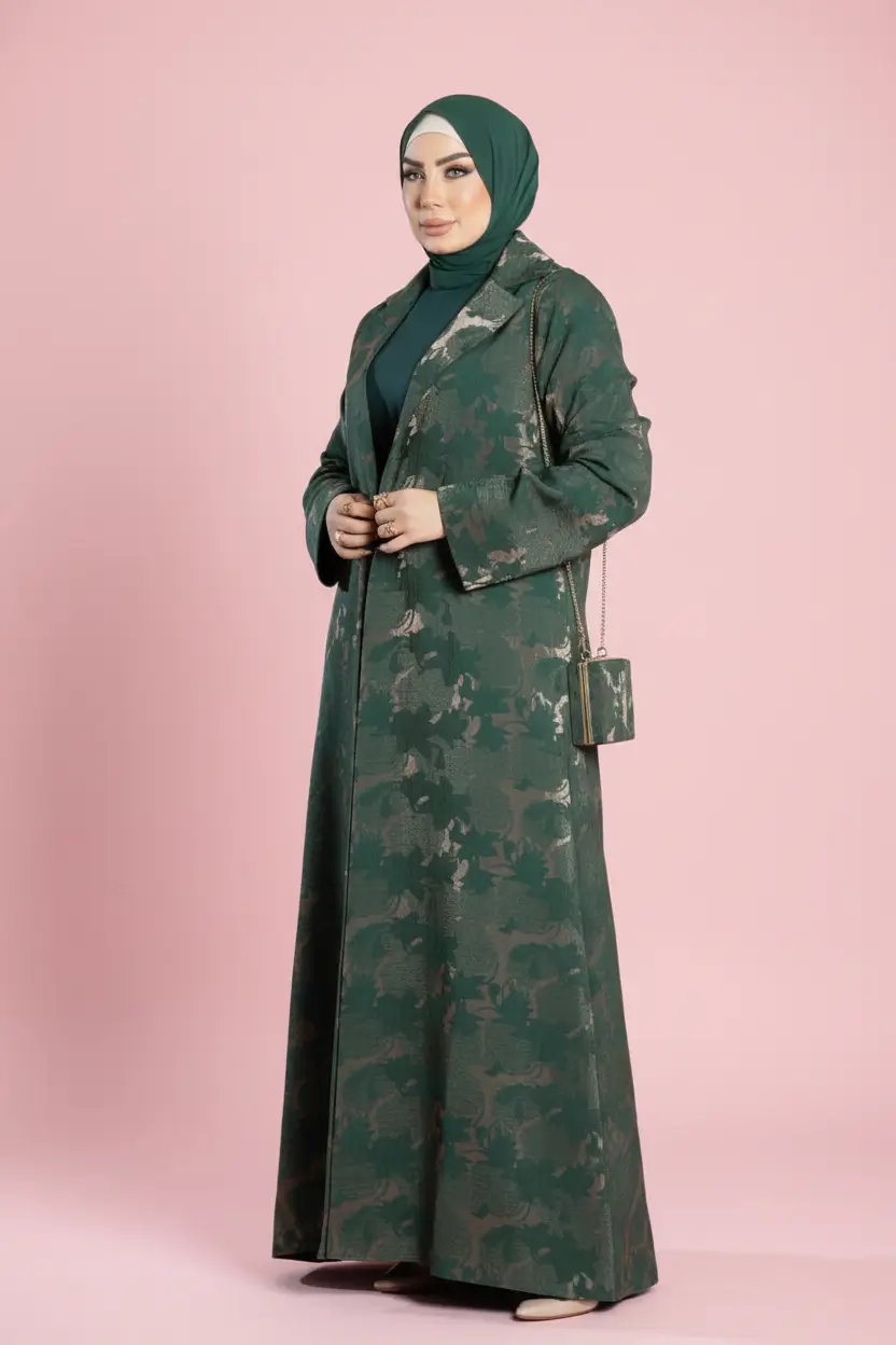 تتميز هذه القطعة بأنها مشغولة من أجود خامات الجاكار (Jacquard)، وهو نسيج يُعرف عالمياً بمتانته ونقوشه الغائرة والبارزة التي لا تبهت مع الزمن. يمنحكِ قماش الجاكار قواماً متماسكاً للعباية، مما يحافظ على تصميم البليزر الرسمي والأنيق في آنٍ واحد.