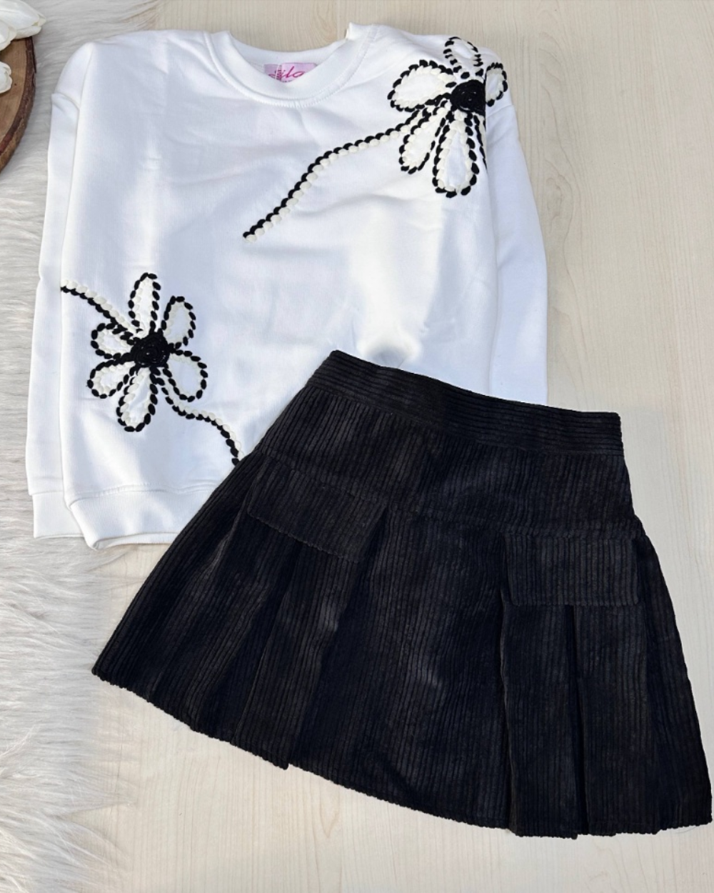 تم اختيار أجود أنواع اقمشة ملابس الاطفال، الميلتون المعالج، والمبطن بطبقة وبرة كثيفة لضمان التدفئة الكاملة دون التضحية بالخفة. أما الجيب (التنورة) من القطيفة المضلع، فتضيف لمسة “تكتشر” غنية تعكس الضوء بجمالية لا تضاهى.